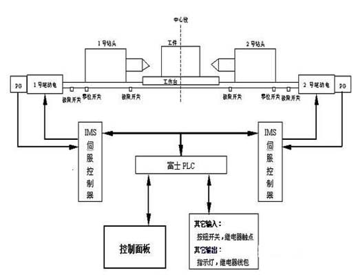 每台进给轴驱动电机由IMS伺服控制器进行位置控制,IMS伺服控制器通过相应编码器(PG)反馈信号构成位置闭环系统。所有的限位开关、零位开关等电气信号直接联进相应的控制器做为控制信号。2台伺服控制器利用内部集成的PLC功能,通过I/O信号与控制面板相连(根据不同用户的要求,也可使用RS422/485通讯的方式进行相应的连线)。由于本套设备相关参数不希看能够由设备操纵者设定,因此控制面板上并没有参数设定功能,取而代之的采用了可即时插拔式手操纵器的方式对相关参数进行修改(由相关技术职员进行修改)。