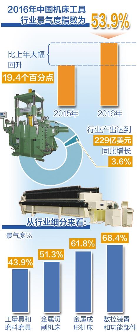 中国机床工具工业协会最新数据显示,2016年中国机床工具行业景气度指数为53.9%,比上年大幅回升19.4个百分点,反映出行业运行呈现回升态势。